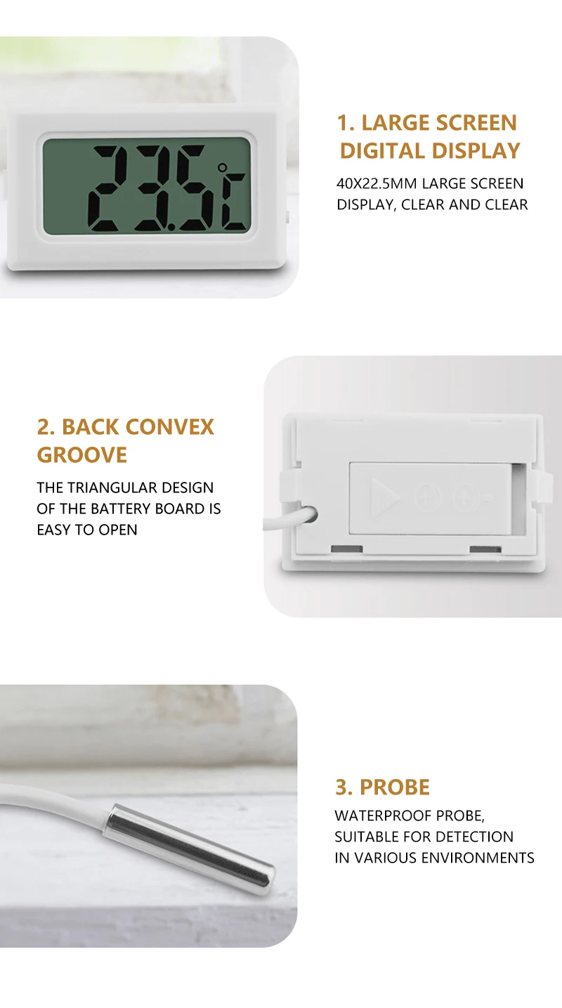 Simple, elegant modeling, LCD panels in-line connections, moisture resistant, strong anti-interference, applies to refrigerated cabinets, display counters and other temperature measurement and display needs of various equipment.