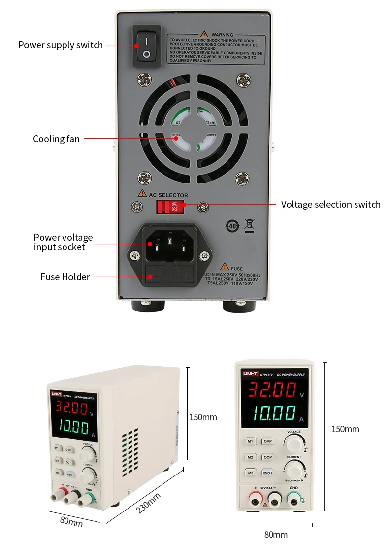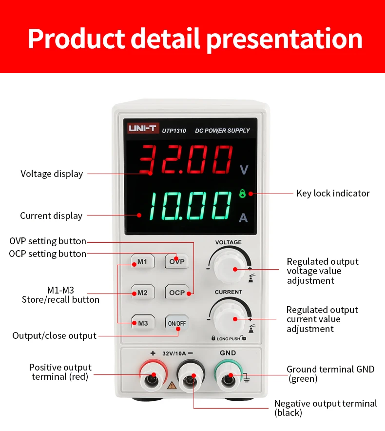 UTP1310 high-quality economical DC power supply has 4 digits voltage and current display, settable over voltage protection (OVP) and over current protection (OCP). It is an ideal tool for school, product line, appliance maintenance center, etc. with highly stable performance.